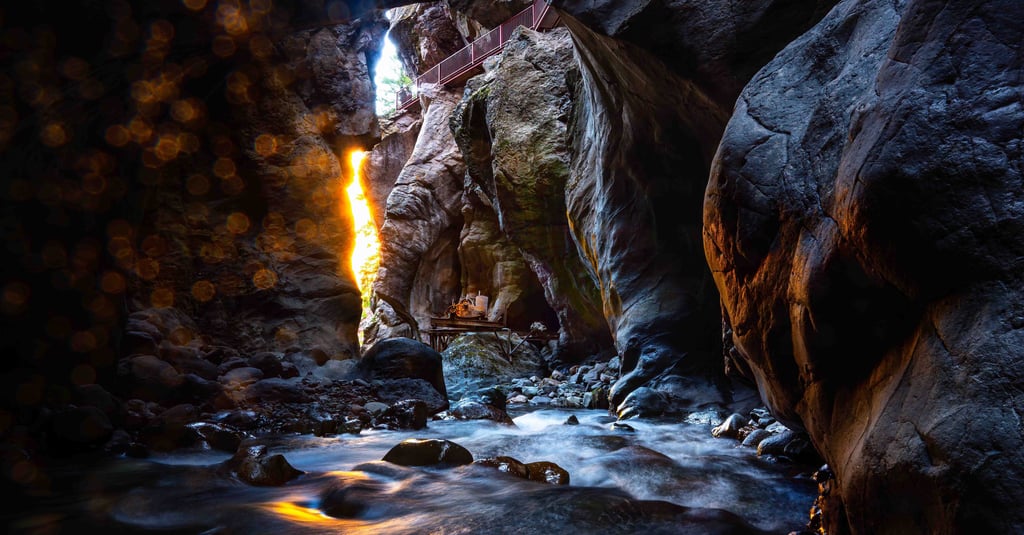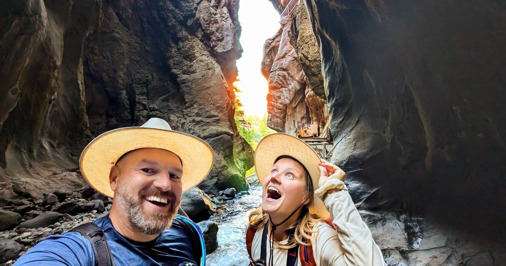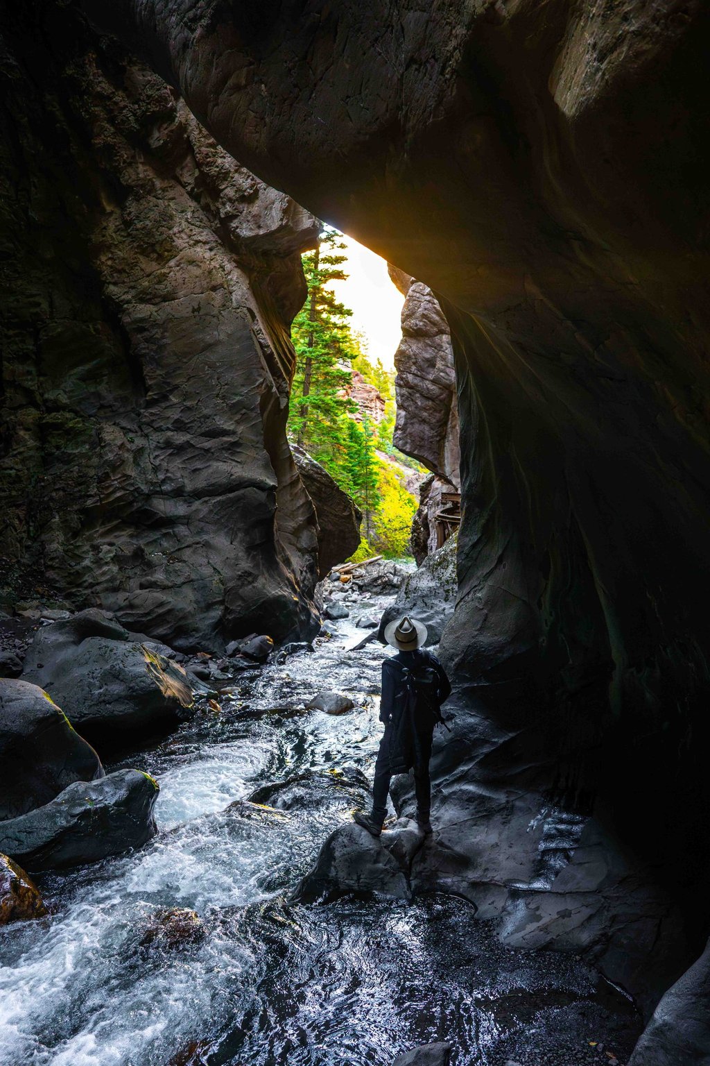 Canyon Creek drops 285 feet through a slot barely ten feet wide, and the sound fills the canyon completely. Standing at the base, you feel it in your chest. If you stepped into that water, you would not step back out.