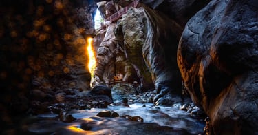 The canyon walls are nearly 1.7 billion years old — some of the oldest exposed rock on the continent. Light reaches the bottom in thin gold lines, the way it does in places that don't get much sun.