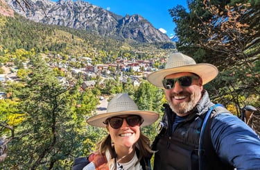 From up there, Ouray looks exactly like what it is — a small Victorian mining town dropped into the bottom of a natural rock amphitheater, ringed on three sides by mountains that don't care how beautiful they are. The trail hugs cliff faces, passes waterfalls, and crosses bridges over gorges. At several points you look straight down into the valley where the Uncompahgre River runs through town below. In fall, with the aspens turning and the red canyon walls lit up against a blue sky, it's one of the more beautiful hikes we've done.