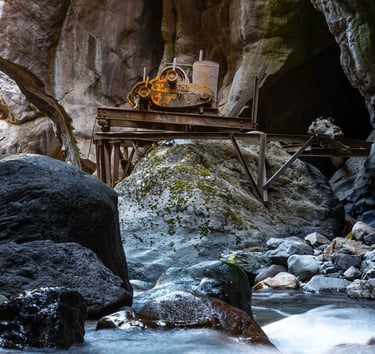 In the 1870s, gold and silver prospectors made camp here. The canyon's flat floor and shelter from the elements made it the obvious place to settle, but those early miners nearly starved their first winter, cut off from supply routes by the same mountains they were trying to dig through. What they left behind is still on the canyon floor. Rusting quietly in the water.