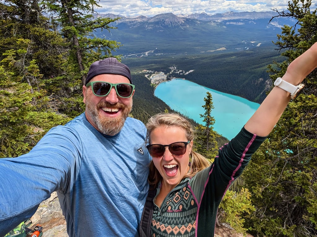 At the summit ridge, the views went from beautiful to unreal. A short walk brought us to the famous gazebo, where Lake Louise looked like a tiny gemstone way, way down the valley.