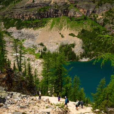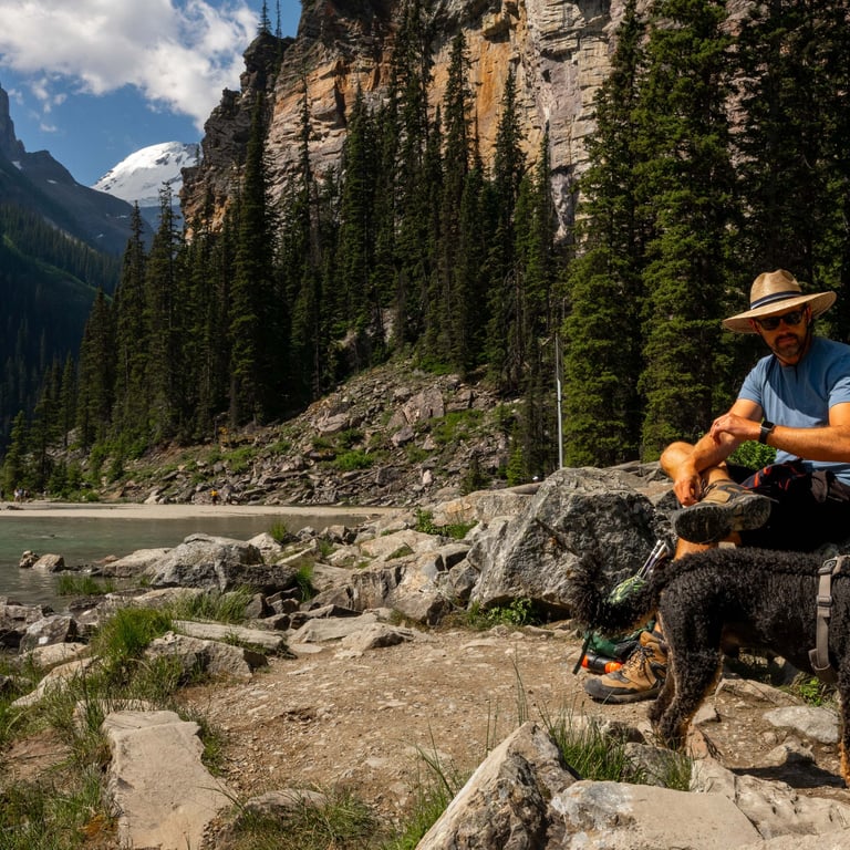 After a steady climb, we reached Lake Agnes — one of the famous “Lakes in the Clouds.” The tea house was buzzing with hikers, so we wandered down the shoreline to find a quiet spot for lunch. Honestly? One of our favorite moments of the entire week.