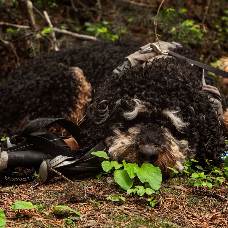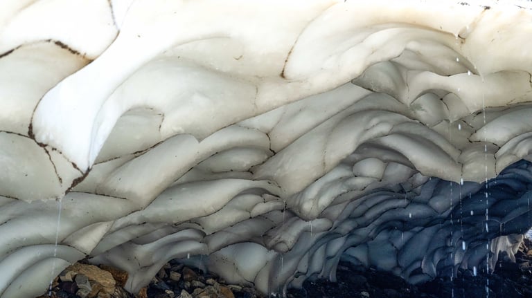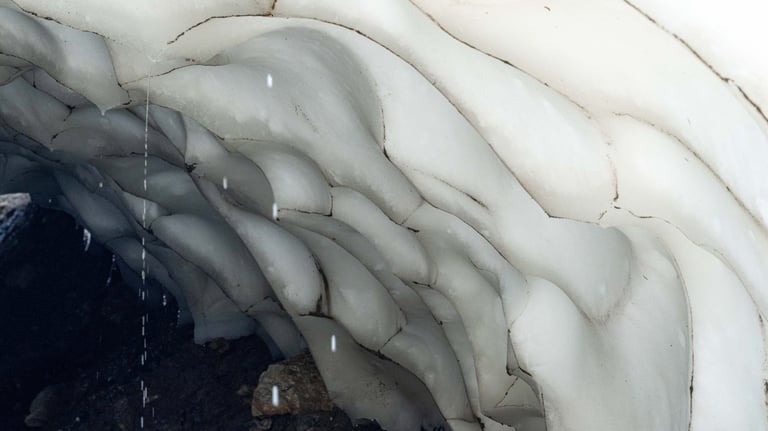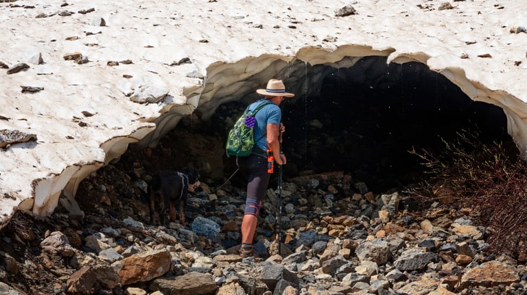 On the way up, we stumbled across a massive snow cave in the hillside. Even in July, pockets of ice linger in the shade, creating these temporary formations that melt and collapse throughout the summer. We admired from a safe distance… and even JoJo knew better than to go inside.